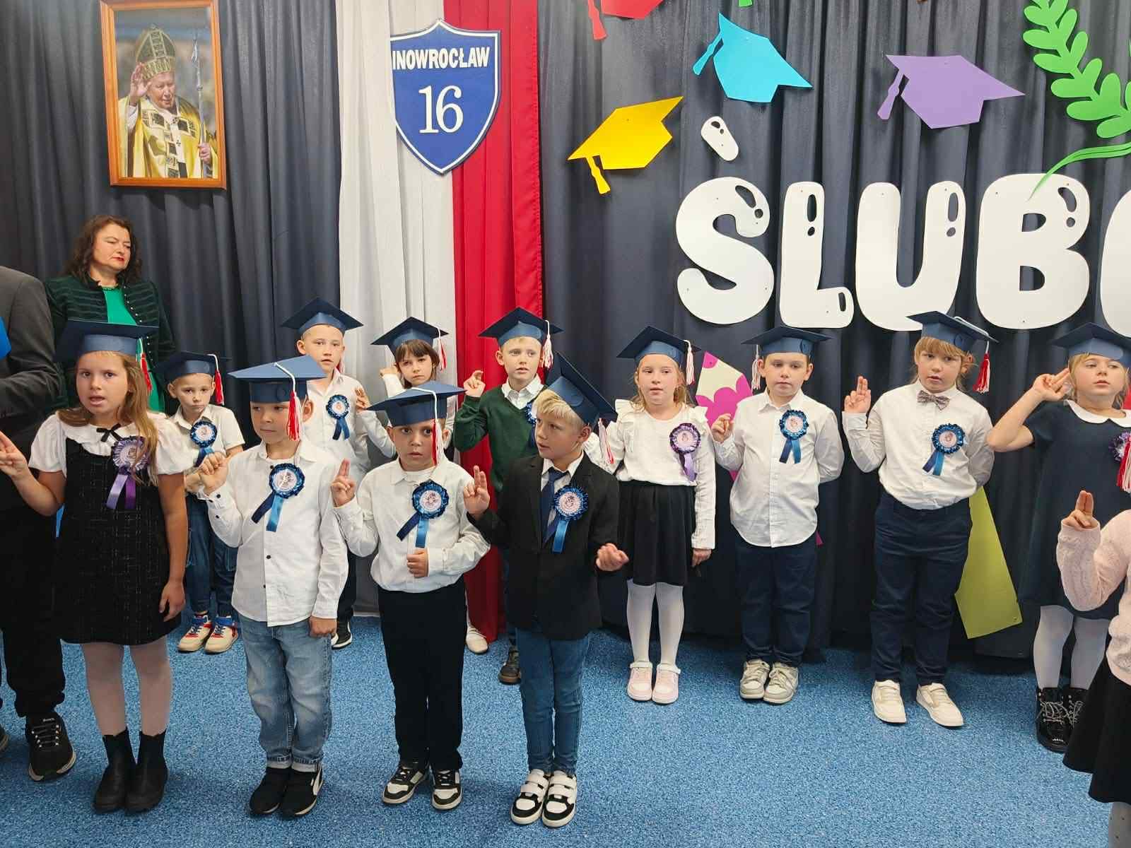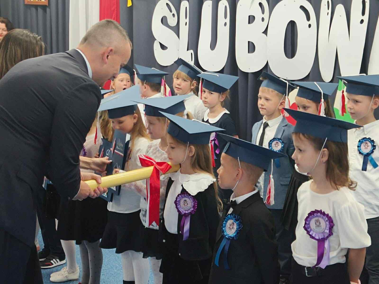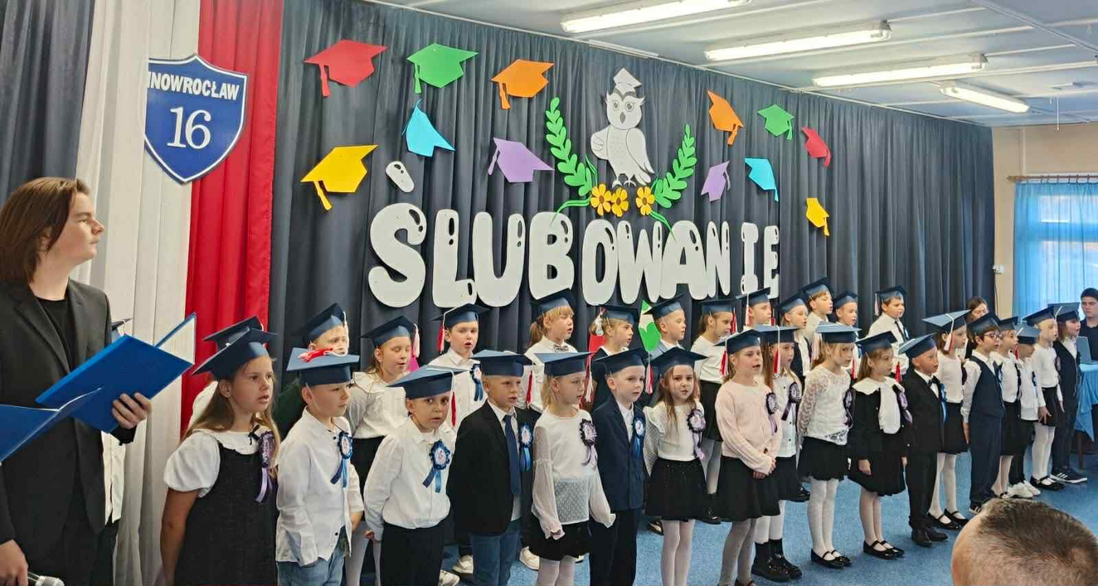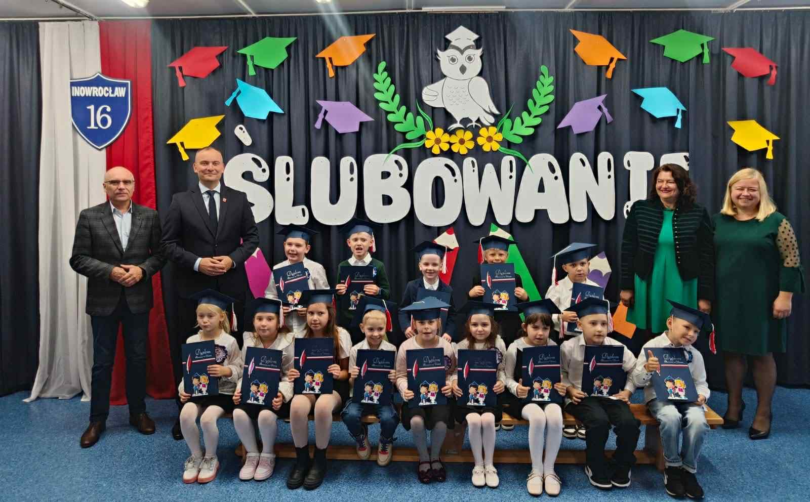 Dnia 9 października w naszej szkole odbyła się wyjątkowa uroczystość – ślubowanie i pasowanie pierwszoklasistów. 👩‍🎓👨‍🎓W wydarzeniu wzięli udział Prezydent Miasta Inowrocławia Pana Arkadiusz Fajok oraz Naczelnik Wydziału Oświaty i Sportu Urzędu Miasta Inowrocławia Pan Jarosław Bosiacki.Zanim najmłodsi uczniowie zostali oficjalnie przyjęci do grona społeczności szkolnej, zaprezentowali swoje umiejętności w śpiewie i recytacji. Pierwszaki głośno i z przekonaniem powtarzały słowa przysięgi, przeczytane przez wicedyrektor szkoły panią Darię Borkowską. Przyrzekały być dobrymi i pilnymi uczniami oraz rzetelnie wypełniać swoje obowiązki. 🇵🇱🏫Najważniejszym momentem było symboliczne pasowanie na ucznia, którego dokonał Prezydent Miasta Pan Arkadiusz Fajok. Następnie wychowawczynie wręczyły pierwszoklasistom pamiątkowe dyplomy. Wszystkim pierwszoklasistom w tak ważnym dla nich dniu życzymy samych sukcesów na nowej drodze obowiązków szkolnych, ☺️natomiast Rodzicom – wielu chwil radości i wzruszeń z sukcesów swoich dzieci, niech każdy dzień będzie powodem do dumy i satysfakcji z ich rozwoju.