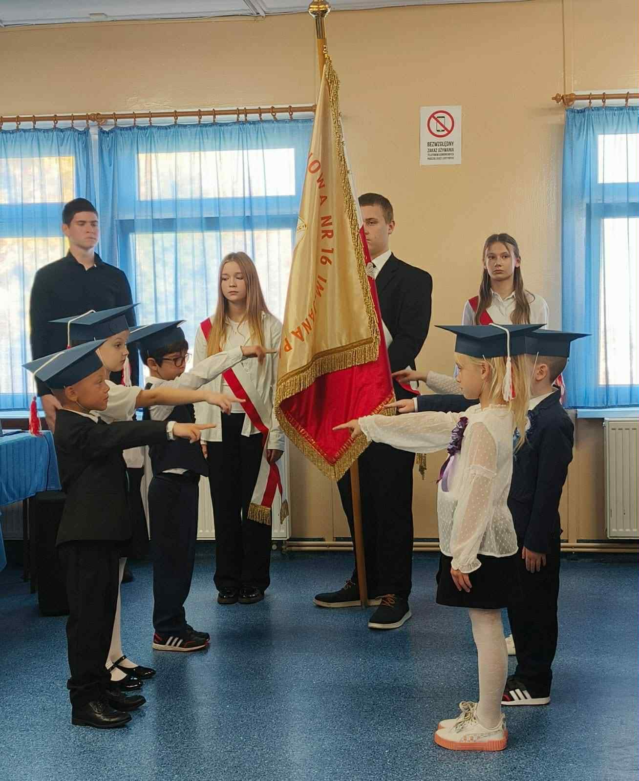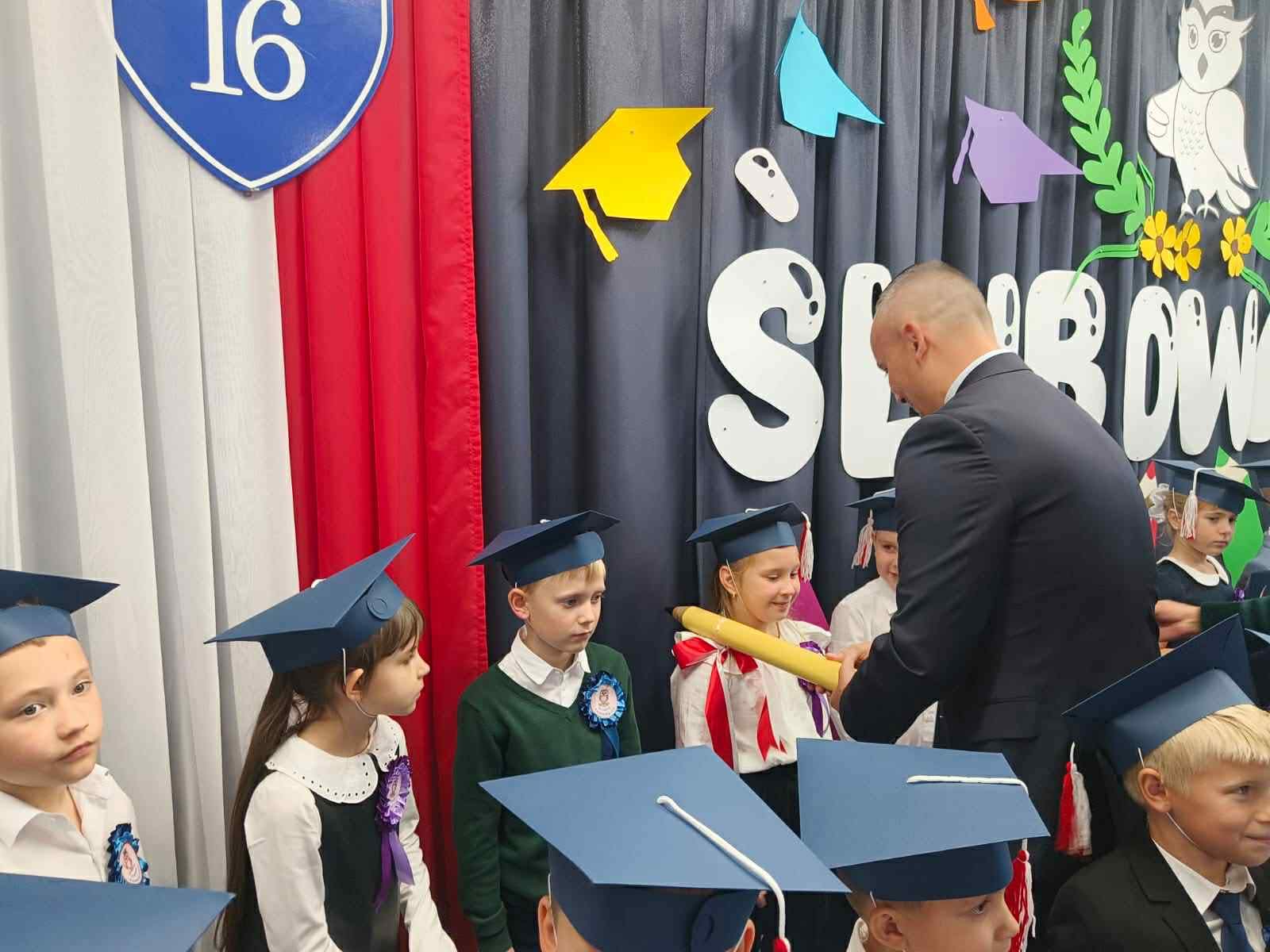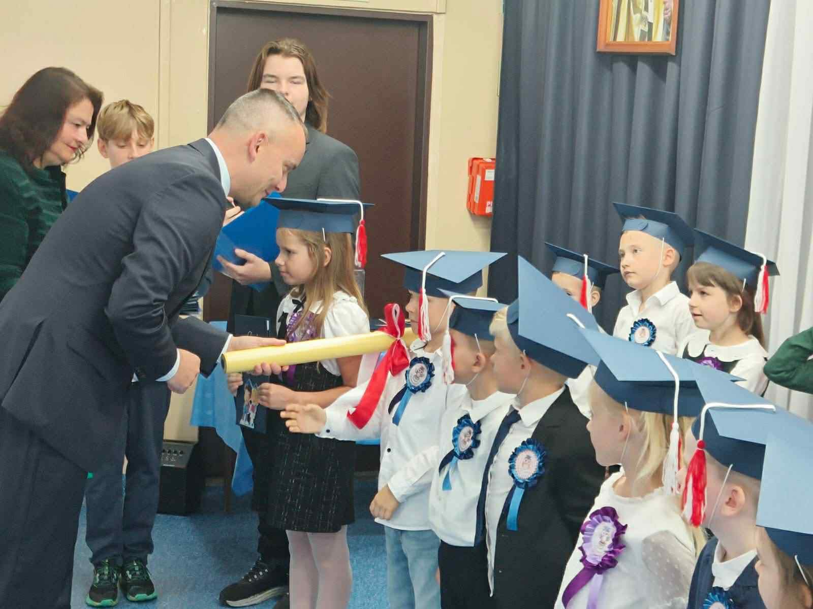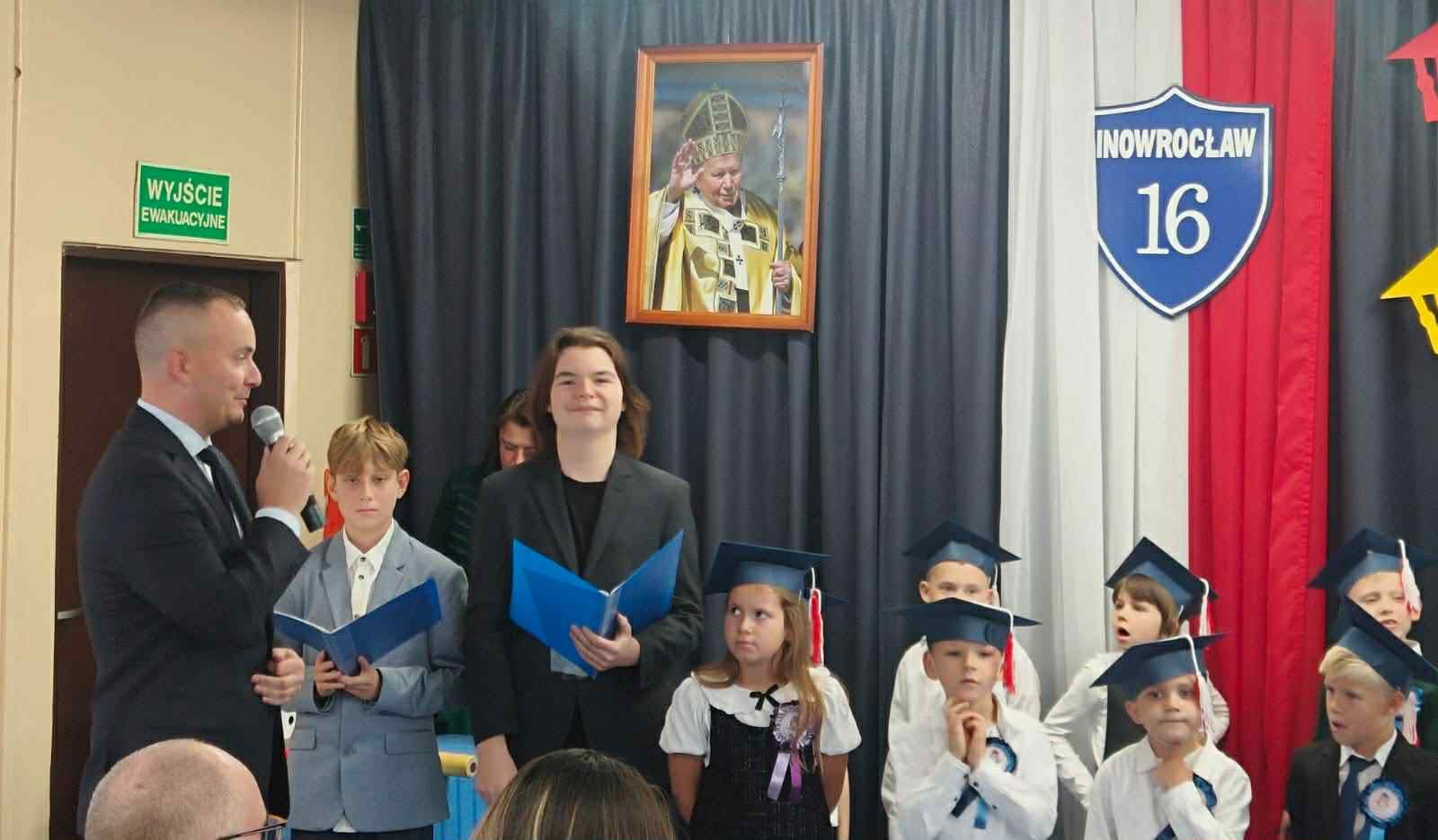 Dnia 9 października w naszej szkole odbyła się wyjątkowa uroczystość – ślubowanie i pasowanie pierwszoklasistów. 👩‍🎓👨‍🎓W wydarzeniu wzięli udział Prezydent Miasta Inowrocławia Pana Arkadiusz Fajok oraz Naczelnik Wydziału Oświaty i Sportu Urzędu Miasta Inowrocławia Pan Jarosław Bosiacki.Zanim najmłodsi uczniowie zostali oficjalnie przyjęci do grona społeczności szkolnej, zaprezentowali swoje umiejętności w śpiewie i recytacji. Pierwszaki głośno i z przekonaniem powtarzały słowa przysięgi, przeczytane przez wicedyrektor szkoły panią Darię Borkowską. Przyrzekały być dobrymi i pilnymi uczniami oraz rzetelnie wypełniać swoje obowiązki. 🇵🇱🏫Najważniejszym momentem było symboliczne pasowanie na ucznia, którego dokonał Prezydent Miasta Pan Arkadiusz Fajok. Następnie wychowawczynie wręczyły pierwszoklasistom pamiątkowe dyplomy. Wszystkim pierwszoklasistom w tak ważnym dla nich dniu życzymy samych sukcesów na nowej drodze obowiązków szkolnych, ☺️natomiast Rodzicom – wielu chwil radości i wzruszeń z sukcesów swoich dzieci, niech każdy dzień będzie powodem do dumy i satysfakcji z ich rozwoju.